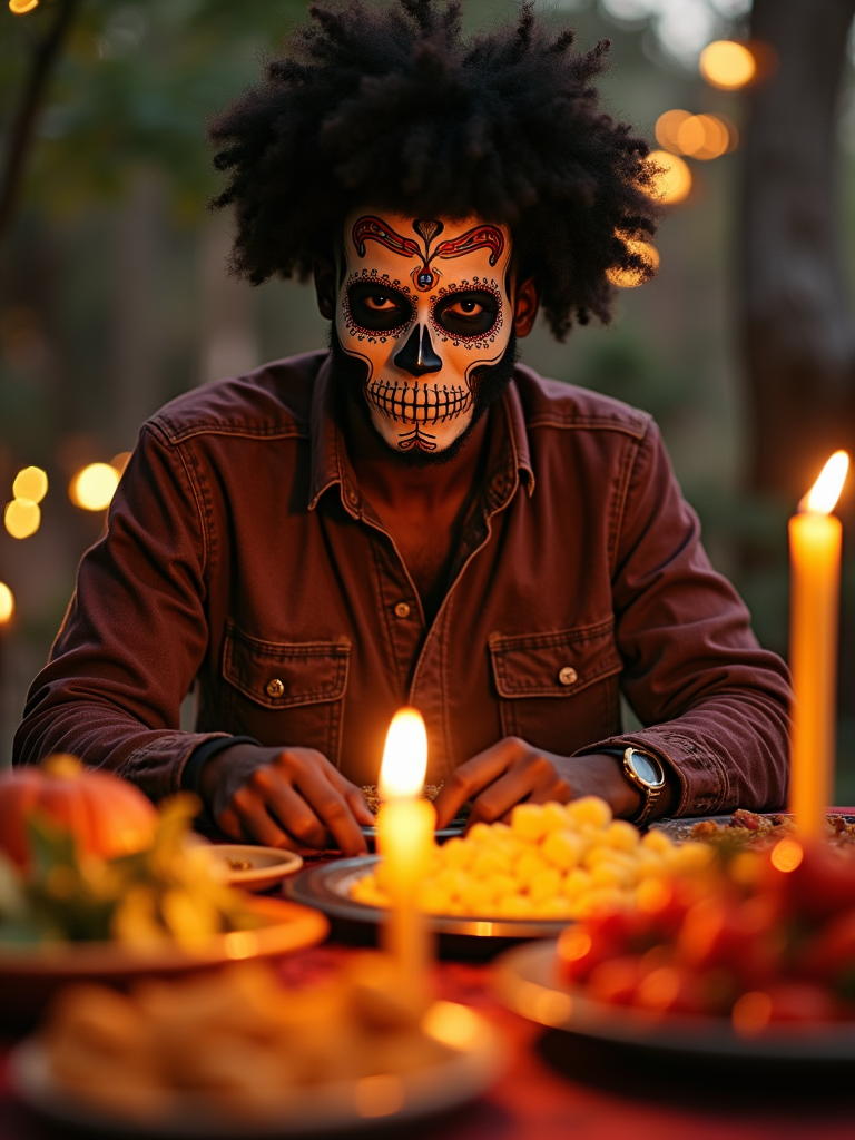 a model enjoying Day of the Dead festivities, surrounded by friends lighting candles at an altar, with a table full of traditional foods and favorite dishes of the departed