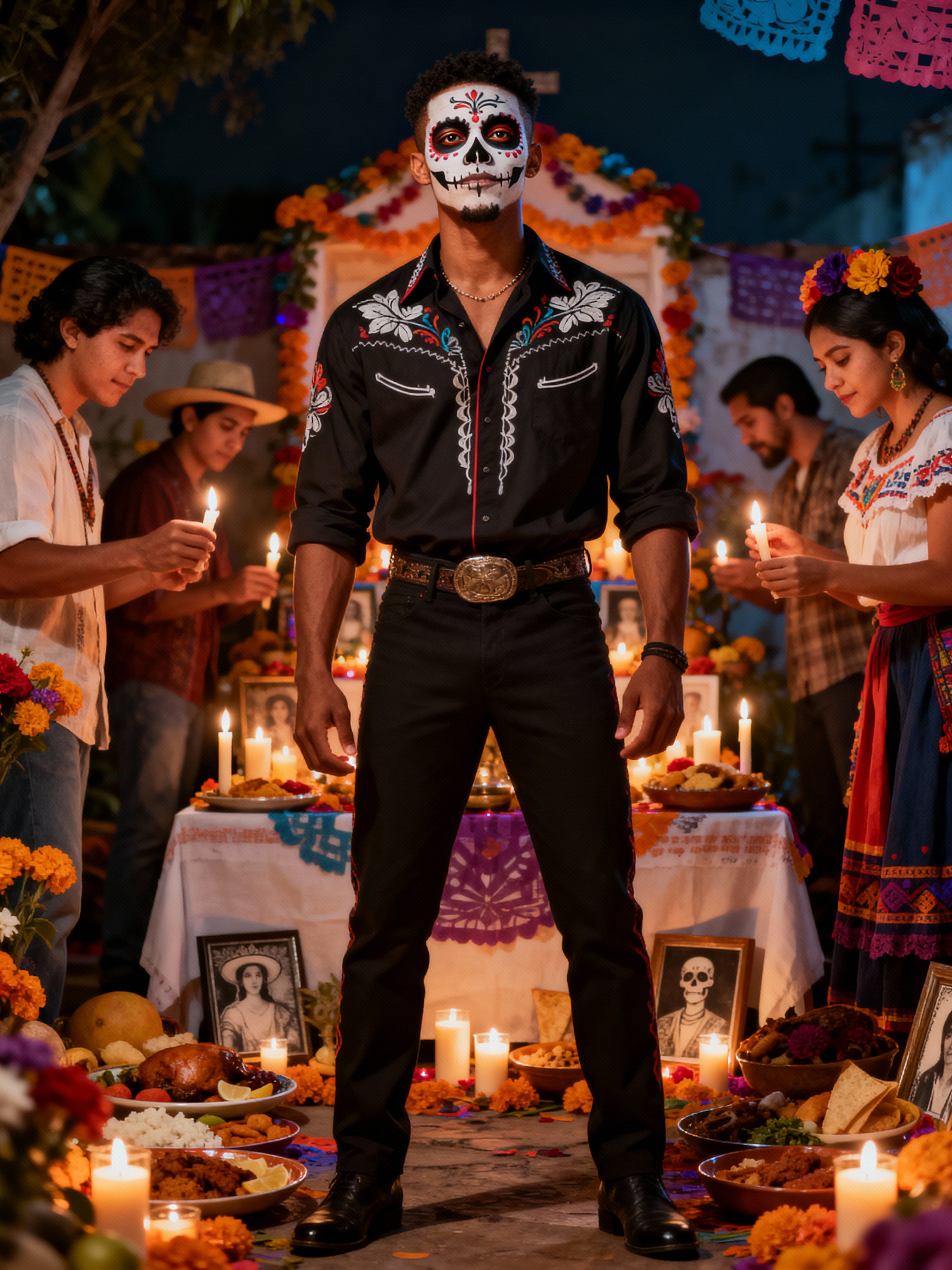 a model enjoying Day of the Dead festivities, surrounded by friends lighting candles at an altar, with a table full of traditional foods and favorite dishes of the departed