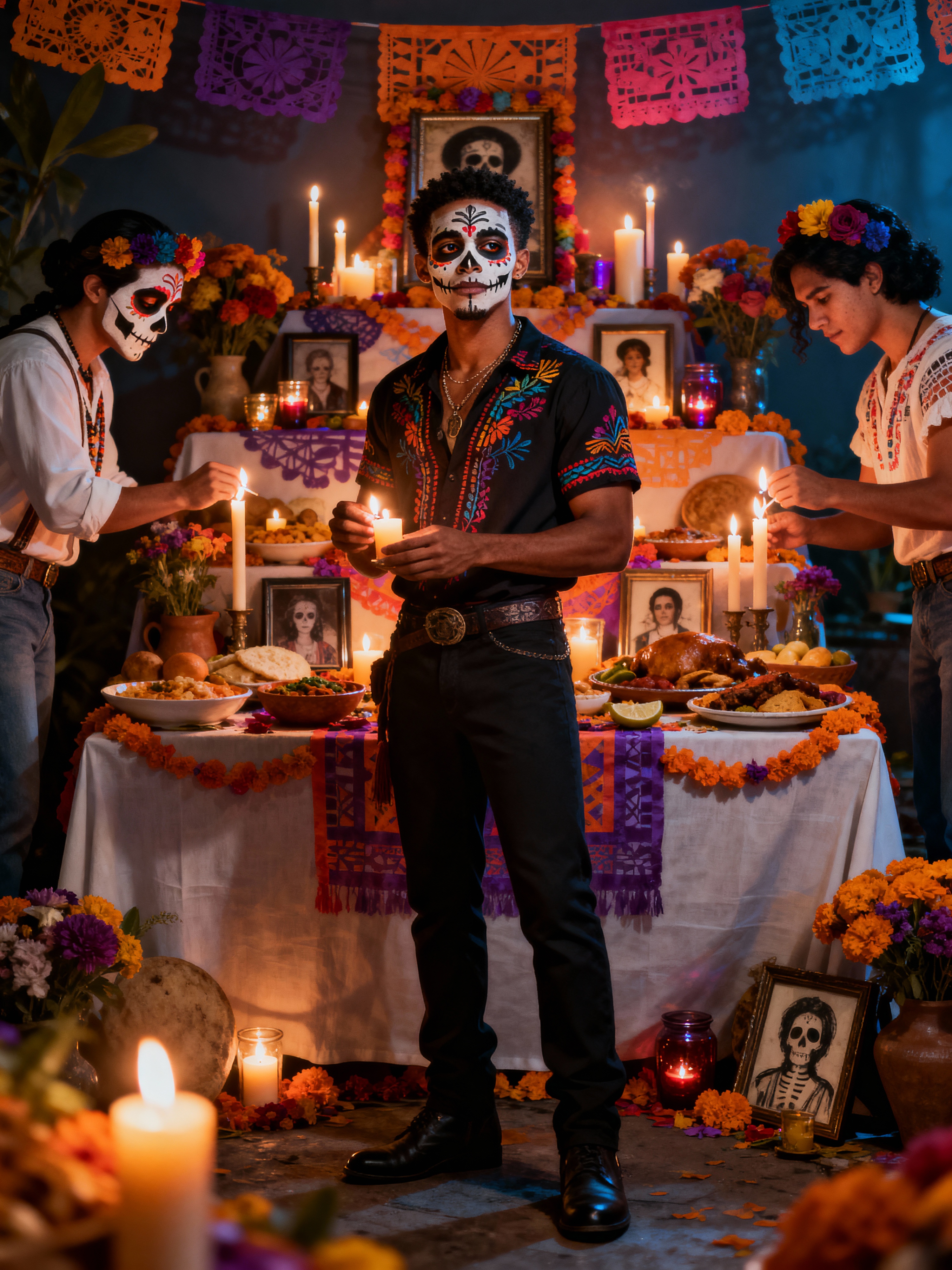 a model enjoying Day of the Dead festivities, surrounded by friends lighting candles at an altar, with a table full of traditional foods and favorite dishes of the departed