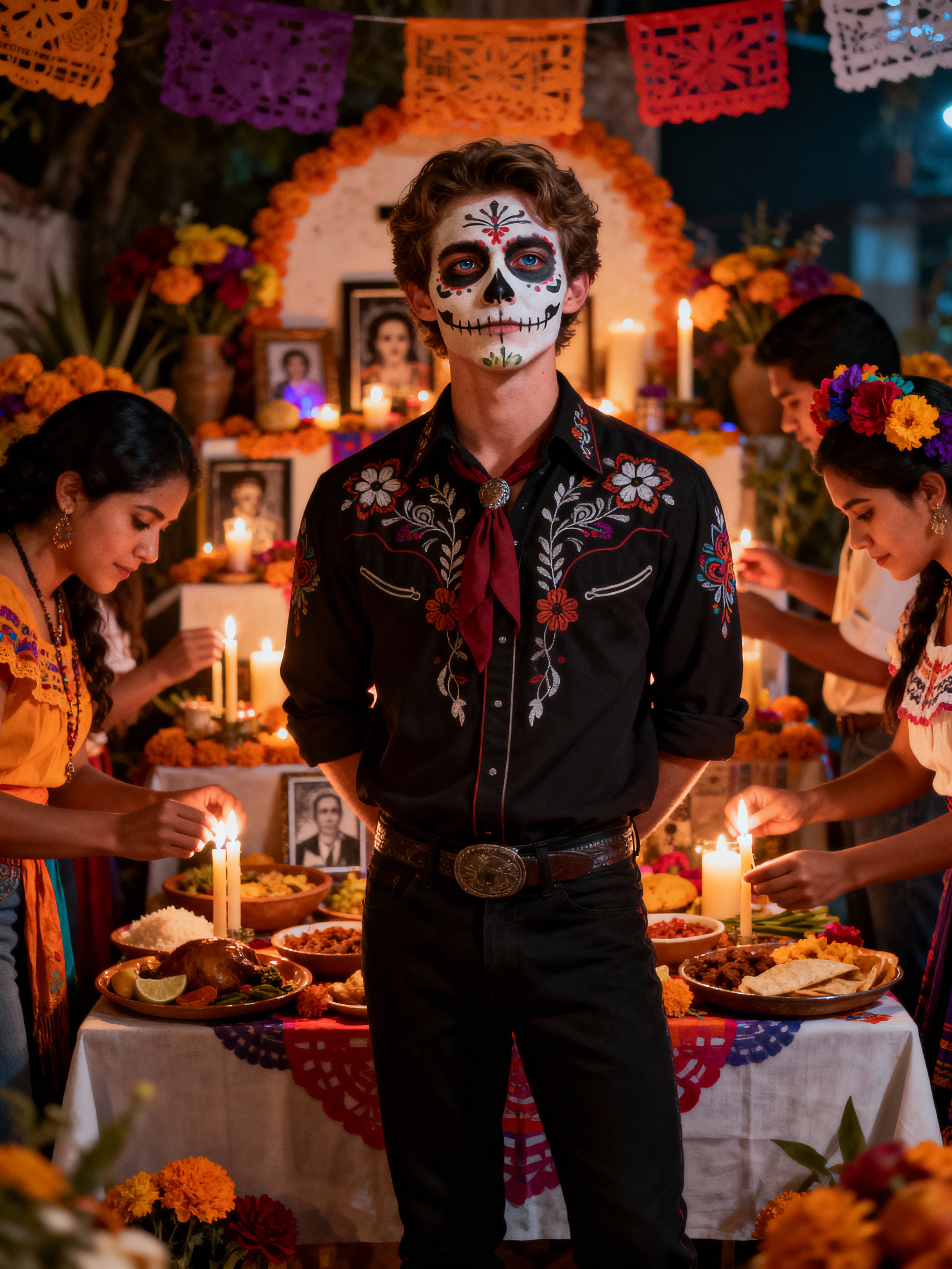 a model enjoying Day of the Dead festivities, surrounded by friends lighting candles at an altar, with a table full of traditional foods and favorite dishes of the departed