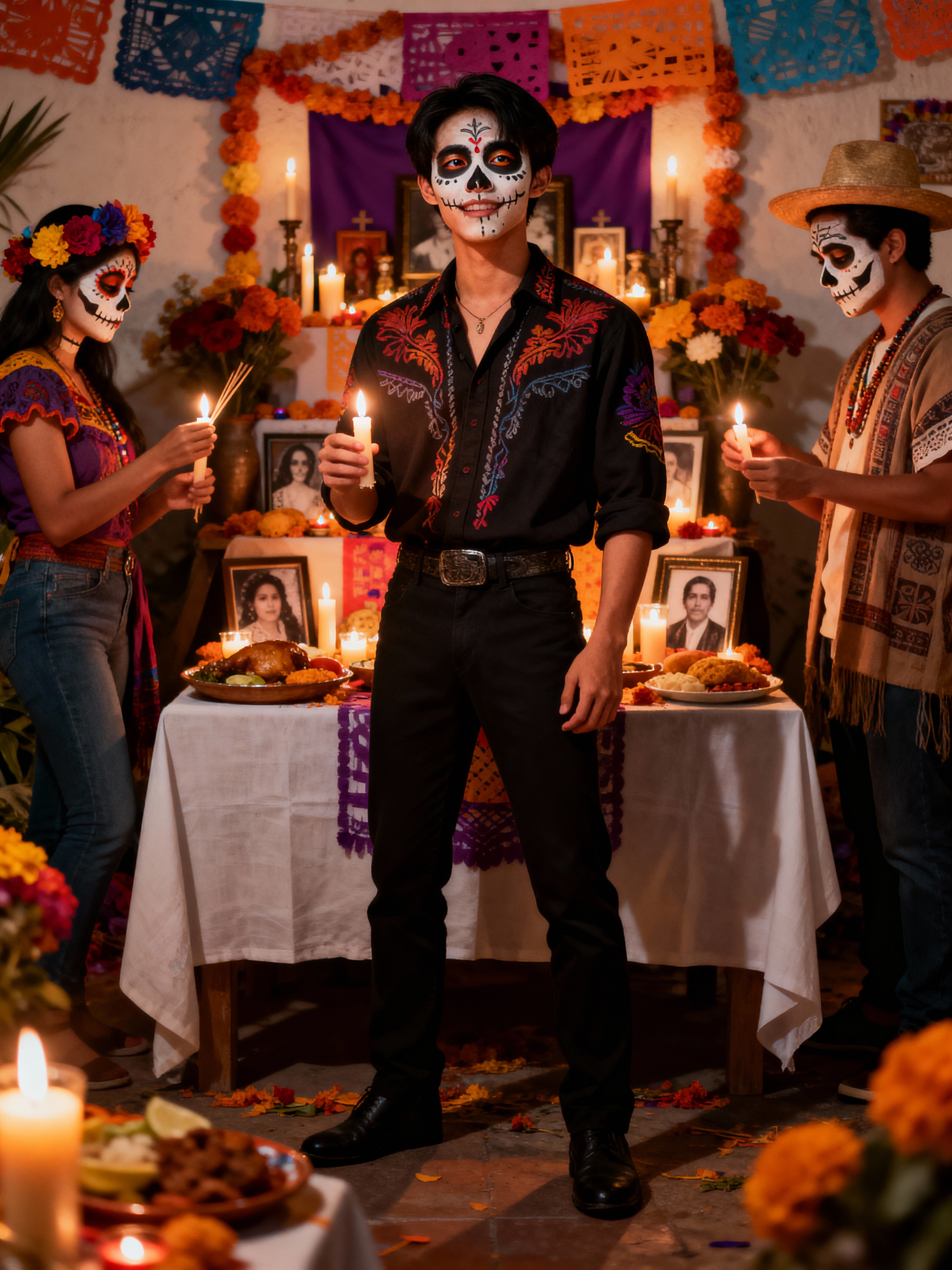 a model enjoying Day of the Dead festivities, surrounded by friends lighting candles at an altar, with a table full of traditional foods and favorite dishes of the departed