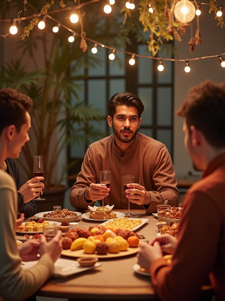 a model enjoying Eid festivities, surrounded by friends gathering for celebration, with a table full of traditional sweets and treats