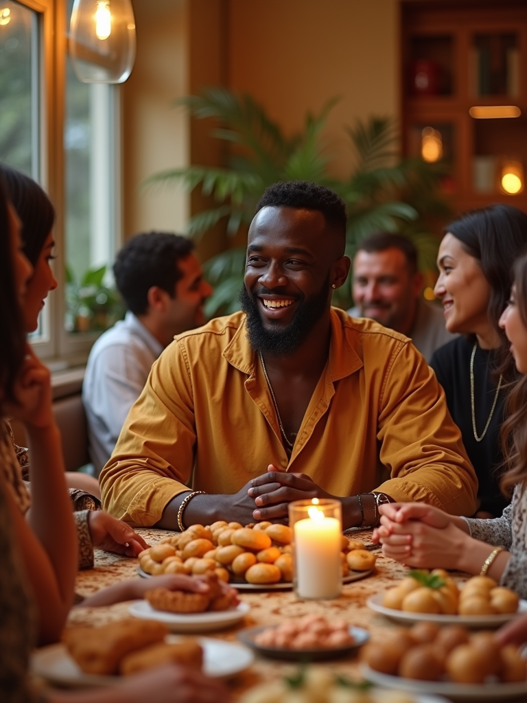 a model enjoying Eid festivities, surrounded by friends gathering for celebration, with a table full of traditional sweets and treats