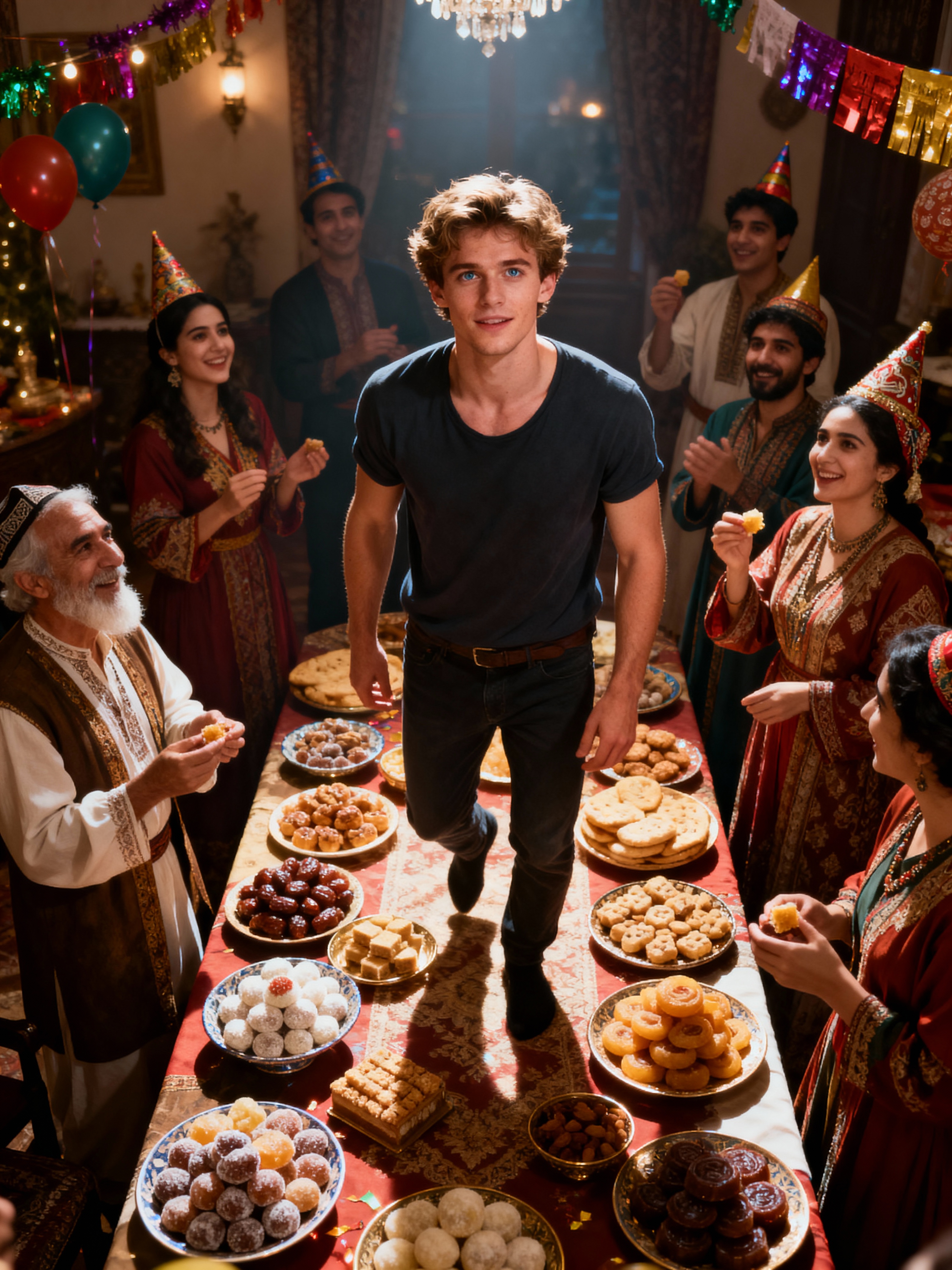 a model enjoying Eid festivities, surrounded by friends gathering for celebration, with a table full of traditional sweets and treats