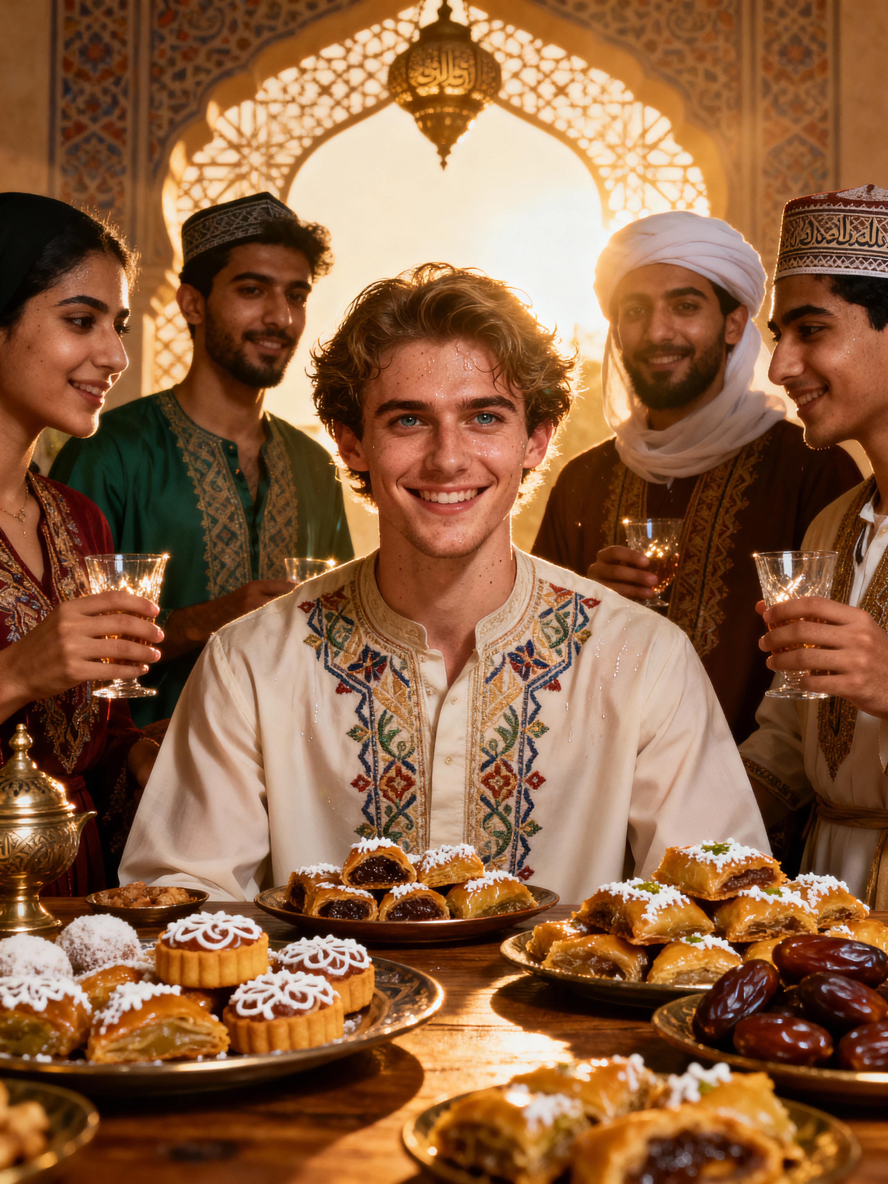 a model enjoying Eid festivities, surrounded by friends gathering for celebration, with a table full of traditional sweets and treats