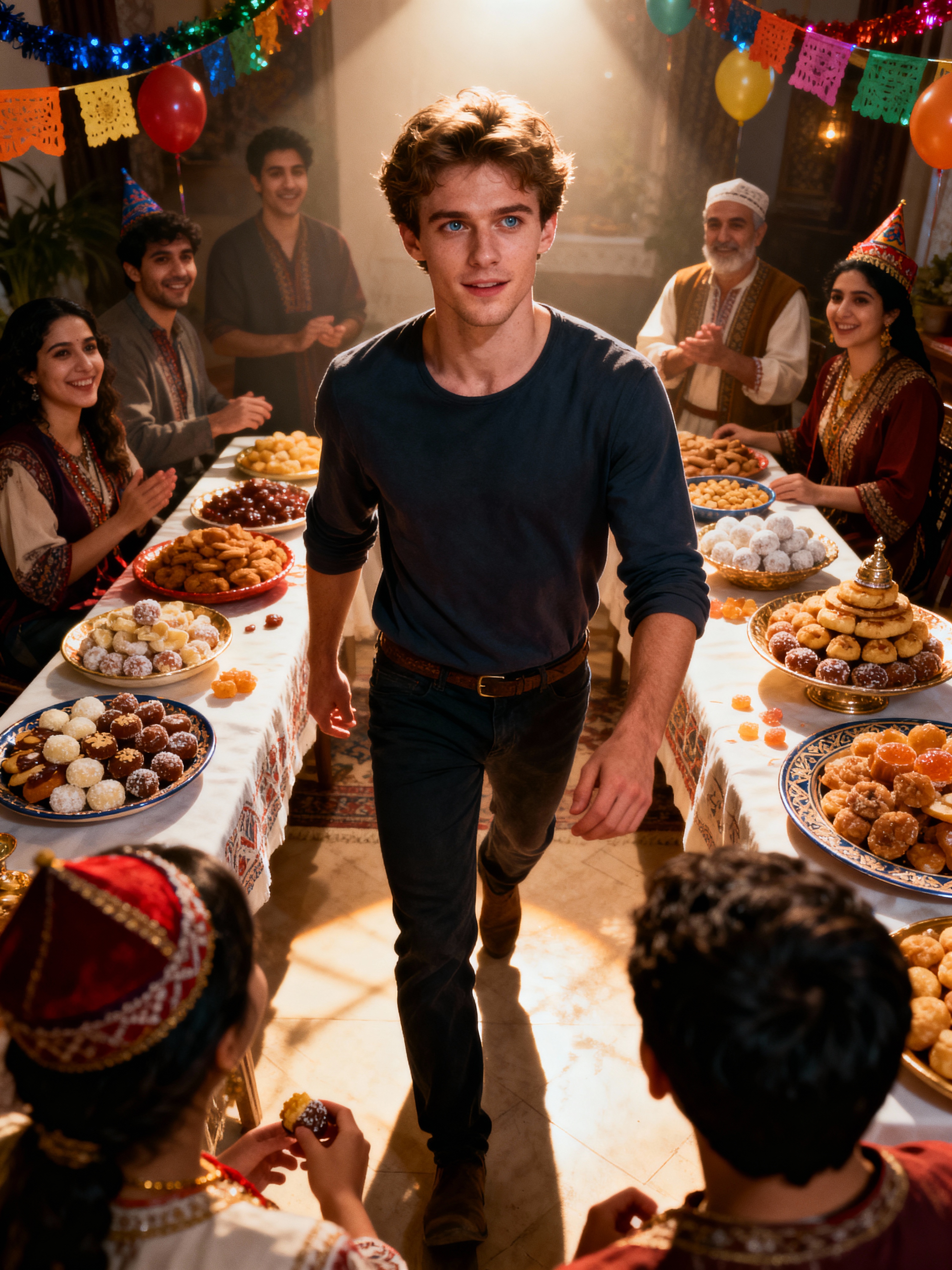 a model enjoying Eid festivities, surrounded by friends gathering for celebration, with a table full of traditional sweets and treats
