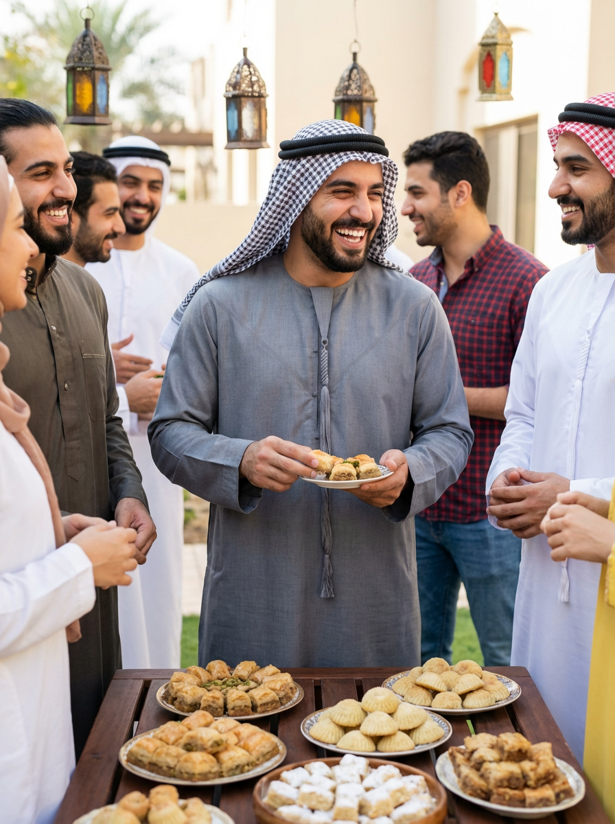 a model enjoying Eid festivities, surrounded by friends gathering for celebration, with a table full of traditional sweets and treats