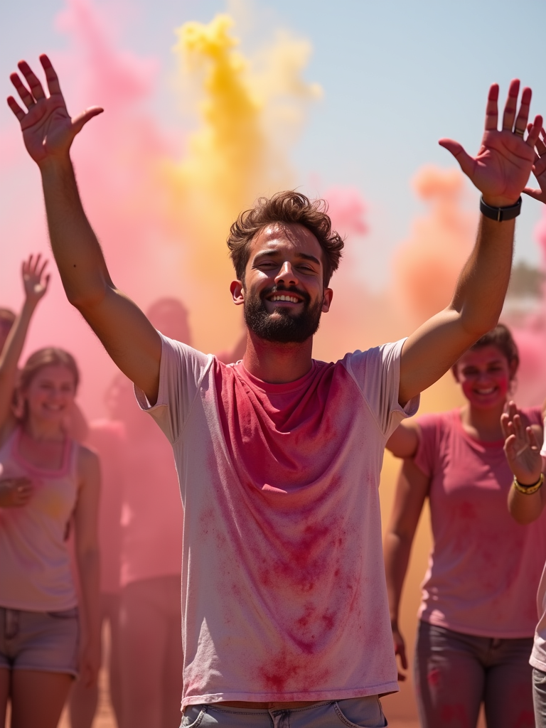 a model enjoying Holi festivities on a sunny day, surrounded by people spraying colored water, raising their hands in celebration with multicolored powder clouds in the air