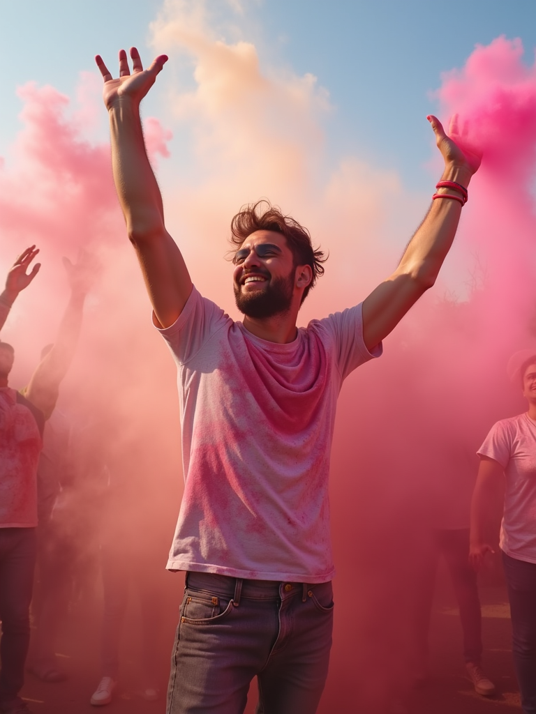 a model enjoying Holi festivities on a sunny day, surrounded by people spraying colored water, raising their hands in celebration with multicolored powder clouds in the air