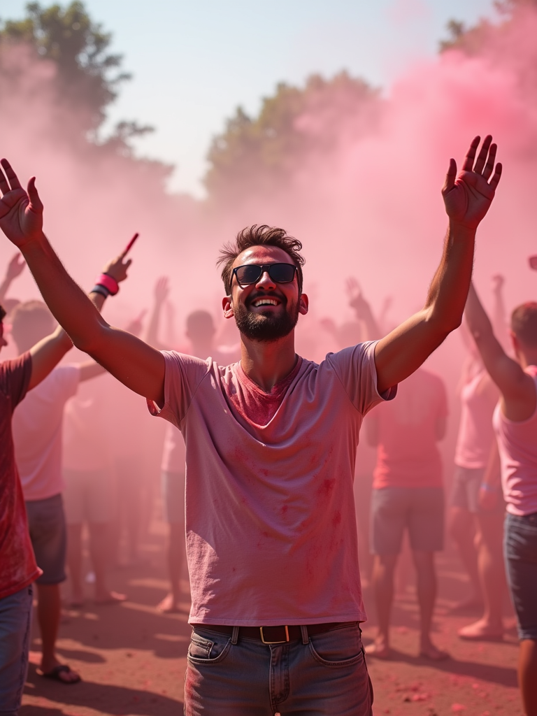 a model enjoying Holi festivities on a sunny day, surrounded by people spraying colored water, raising their hands in celebration with multicolored powder clouds in the air