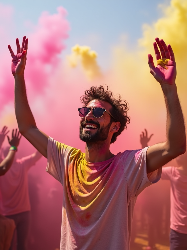 a model enjoying Holi festivities on a sunny day, surrounded by people spraying colored water, raising their hands in celebration with multicolored powder clouds in the air