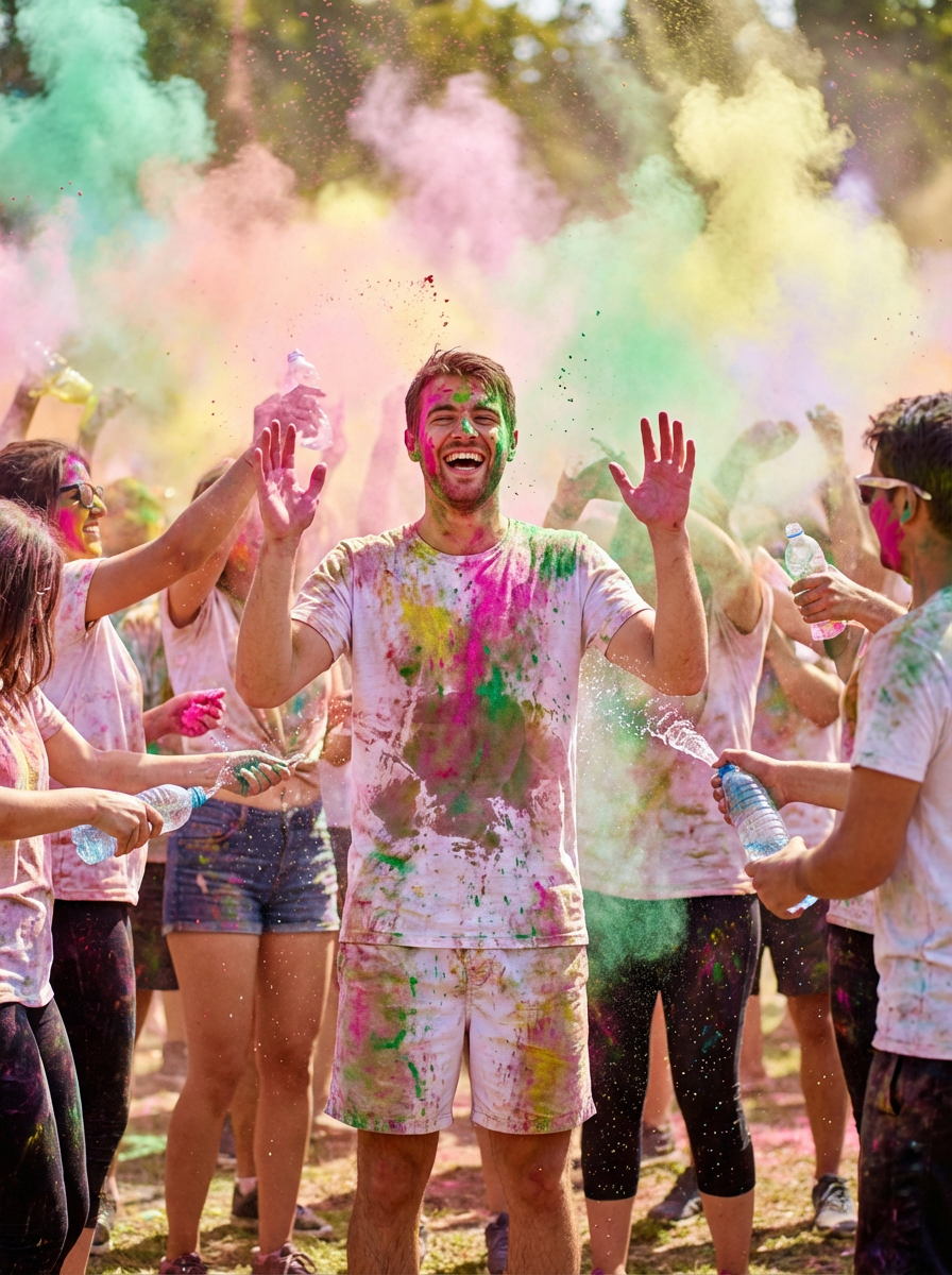 a model enjoying Holi festivities on a sunny day, surrounded by people spraying colored water, raising their hands in celebration with multicolored powder clouds in the air