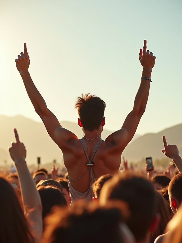 a model enjoying live music on a sunny day at Coachella, surrounded by energetic fans and raising their hands in excitement, with desert mountains in the distance