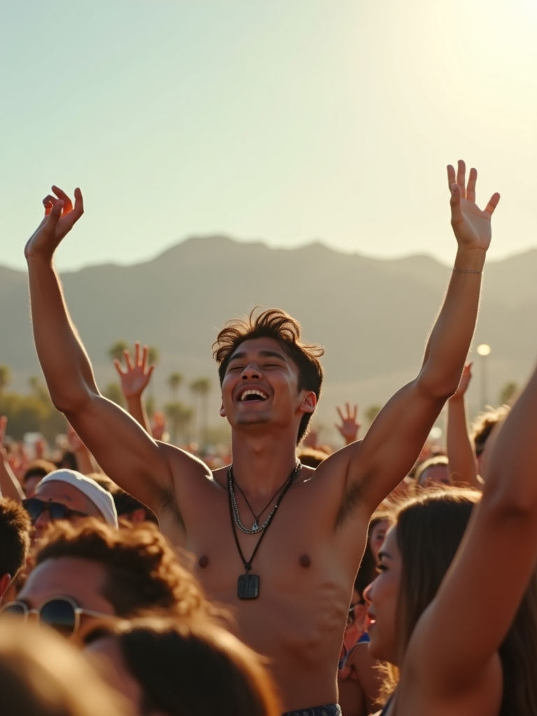 a model enjoying live music on a sunny day at Coachella, surrounded by energetic fans and raising their hands in excitement, with desert mountains in the distance