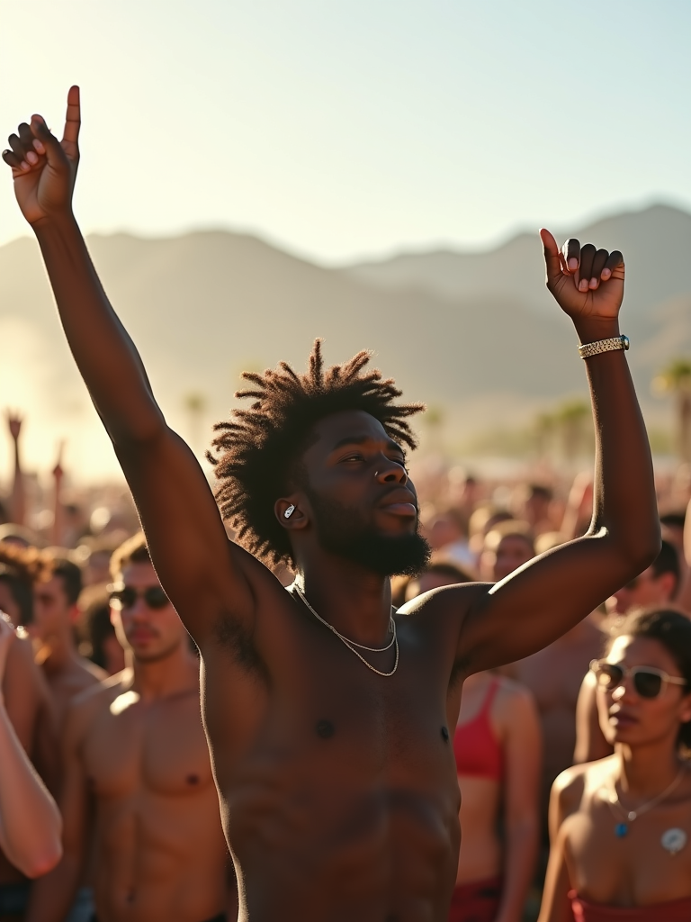 a model enjoying live music on a sunny day at Coachella, surrounded by energetic fans and raising their hands in excitement, with desert mountains in the distance