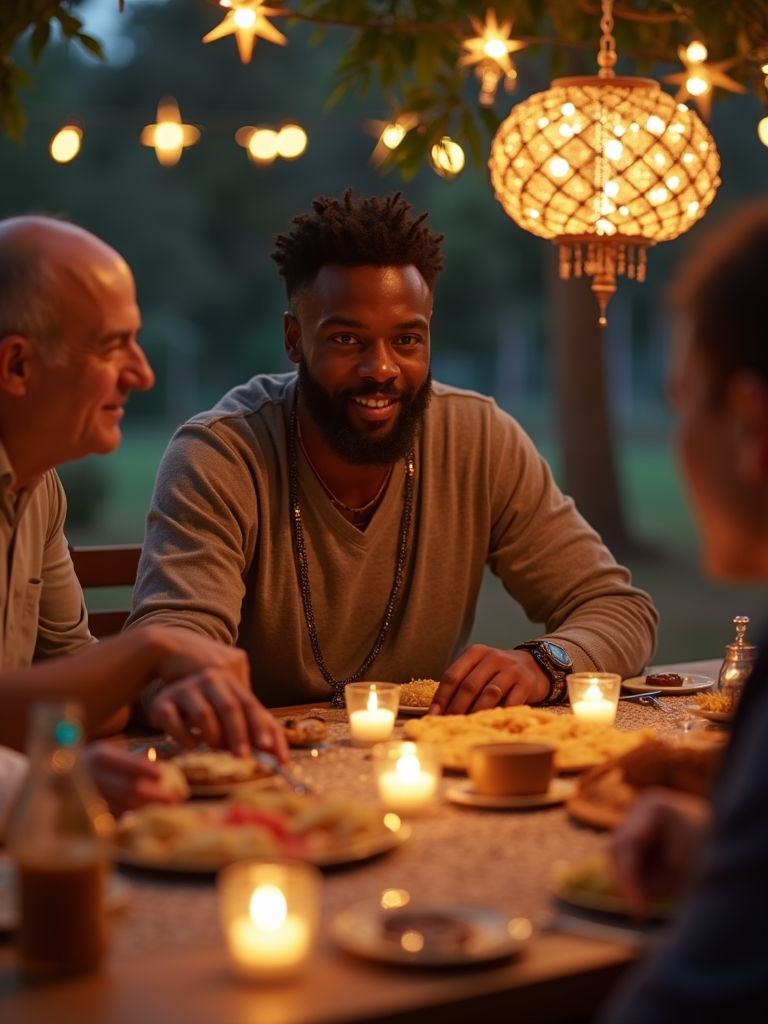 a model enjoying Ramadan festivities in the evening, surrounded by friends gathering for breaking fast, with a table full of traditional foods and sweet treats
