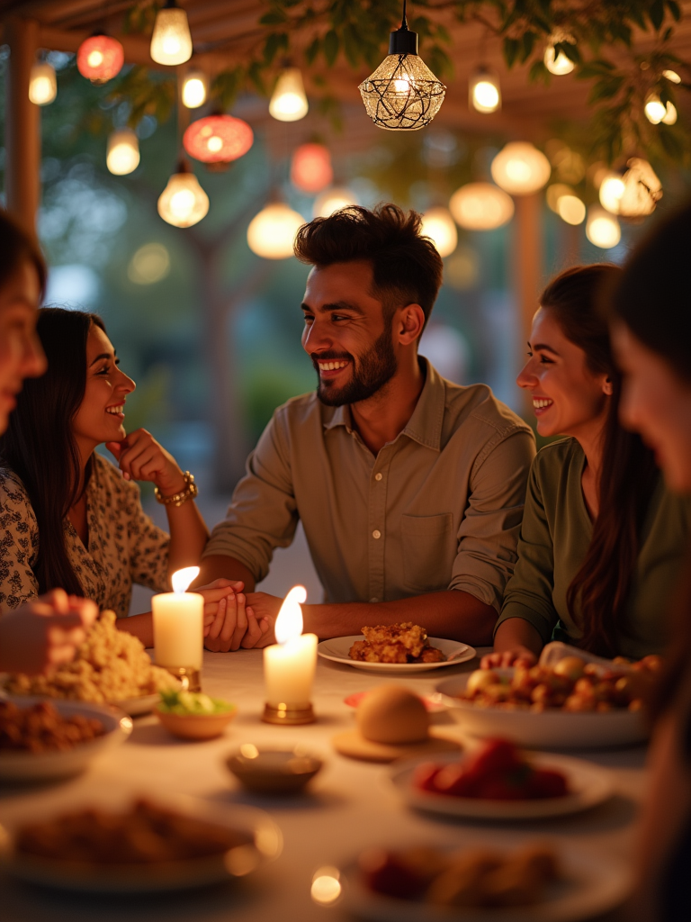 a model enjoying Ramadan festivities in the evening, surrounded by friends gathering for breaking fast, with a table full of traditional foods and sweet treats