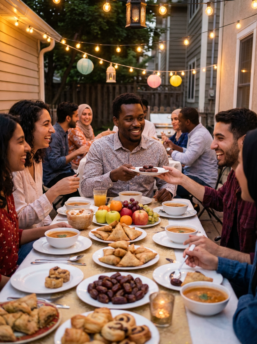 a model enjoying Ramadan festivities in the evening, surrounded by friends gathering for breaking fast, with a table full of traditional foods and sweet treats