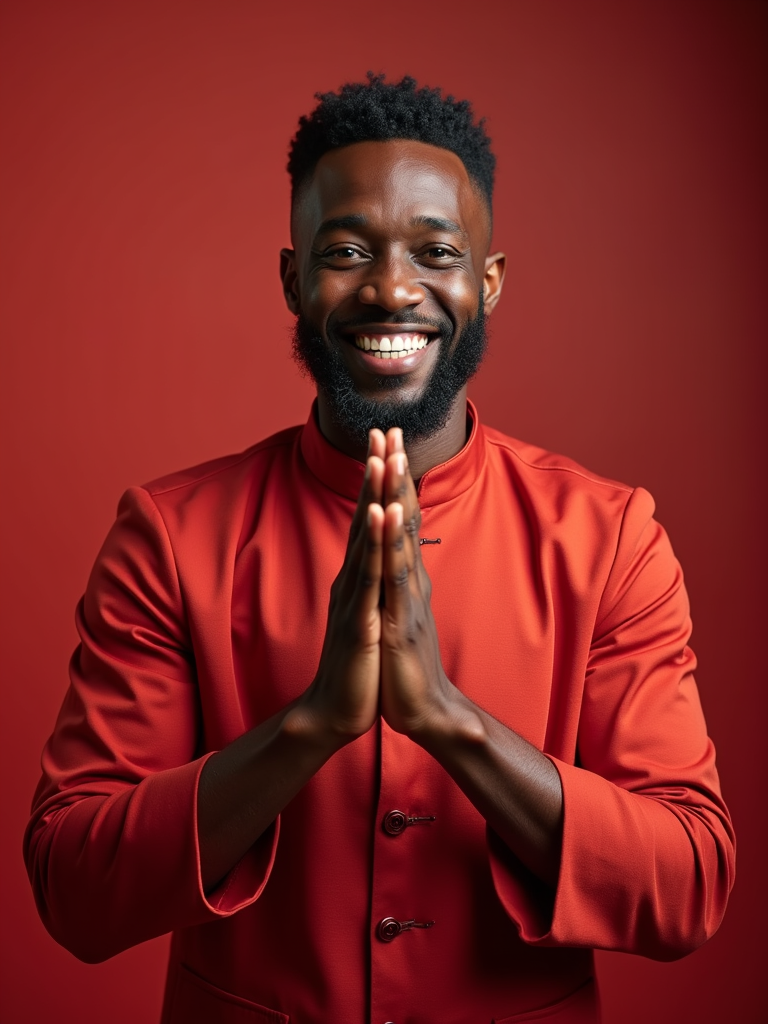 a model enjoying the Chinese New Year atmosphere, with hands making traditional greeting gesture, radiating happiness and prosperity