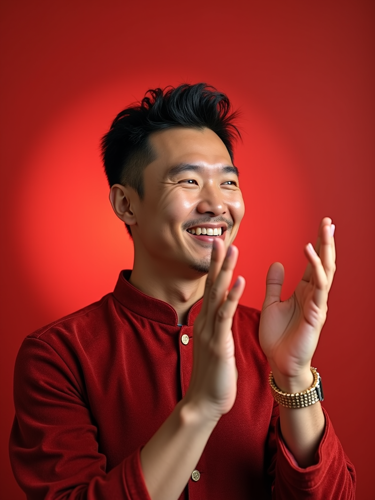 a model enjoying the Chinese New Year atmosphere, with hands making traditional greeting gesture, radiating happiness and prosperity