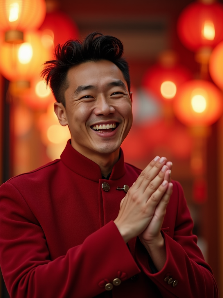 a model enjoying the Chinese New Year atmosphere, with hands making traditional greeting gesture, radiating happiness and prosperity