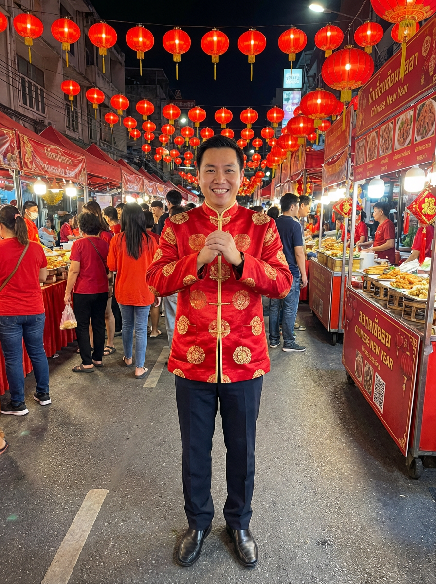 a model enjoying the Chinese New Year atmosphere, with hands making traditional greeting gesture, radiating happiness and prosperity