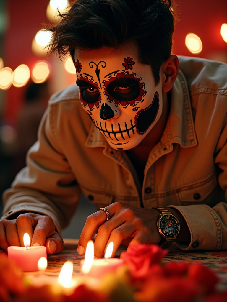 a model enjoying the Día de los Muertos atmosphere, with hands arranging photos on an ofrenda, radiating respect and celebration of life