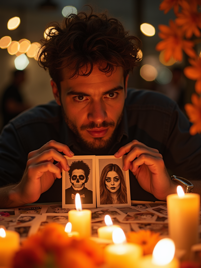 a model enjoying the Día de los Muertos atmosphere, with hands arranging photos on an ofrenda, radiating respect and celebration of life