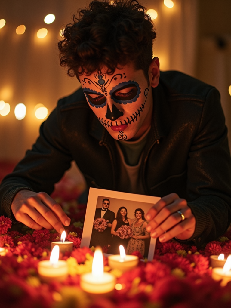 a model enjoying the Día de los Muertos atmosphere, with hands arranging photos on an ofrenda, radiating respect and celebration of life