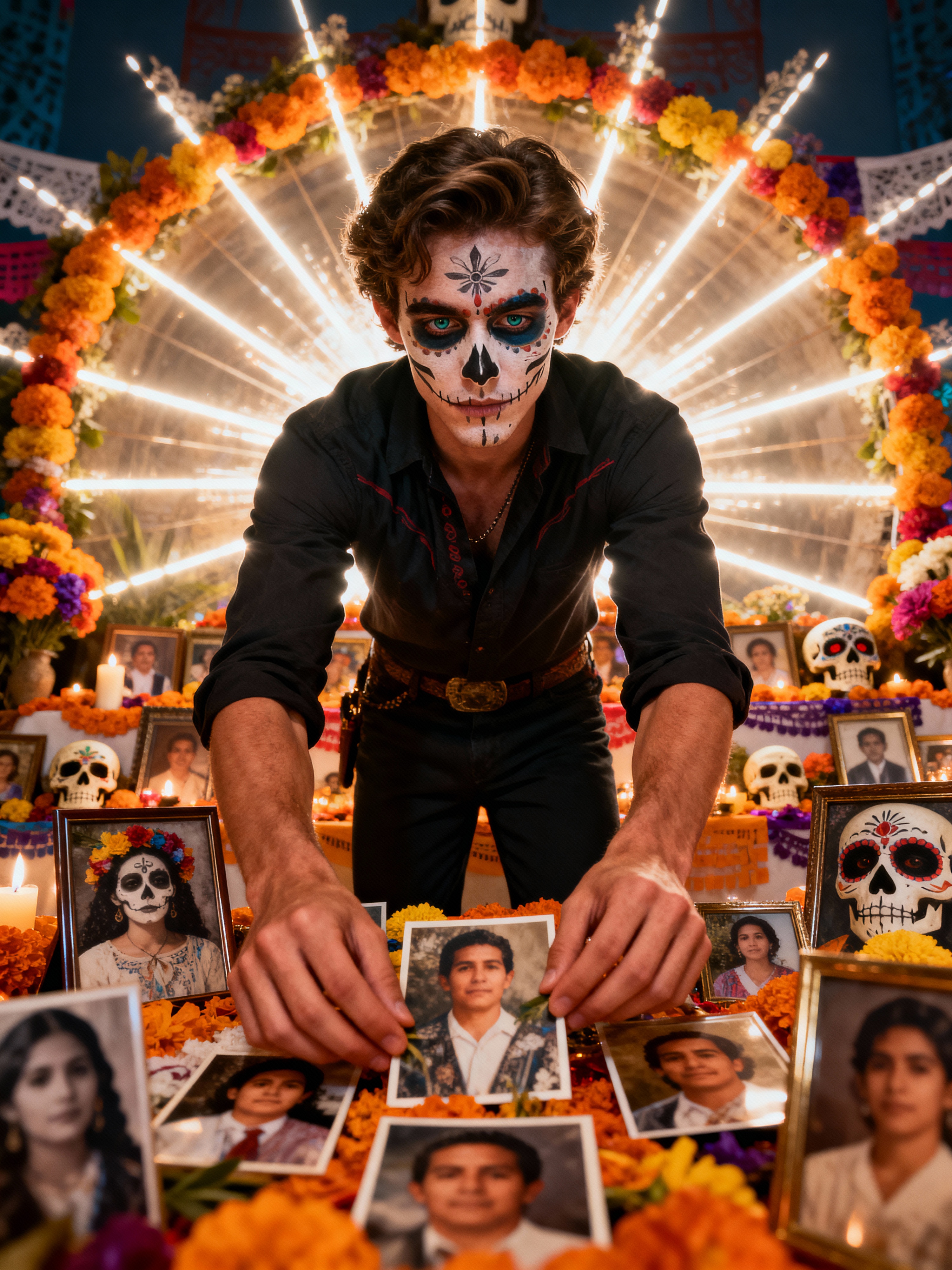 a model enjoying the Día de los Muertos atmosphere, with hands arranging photos on an ofrenda, radiating respect and celebration of life