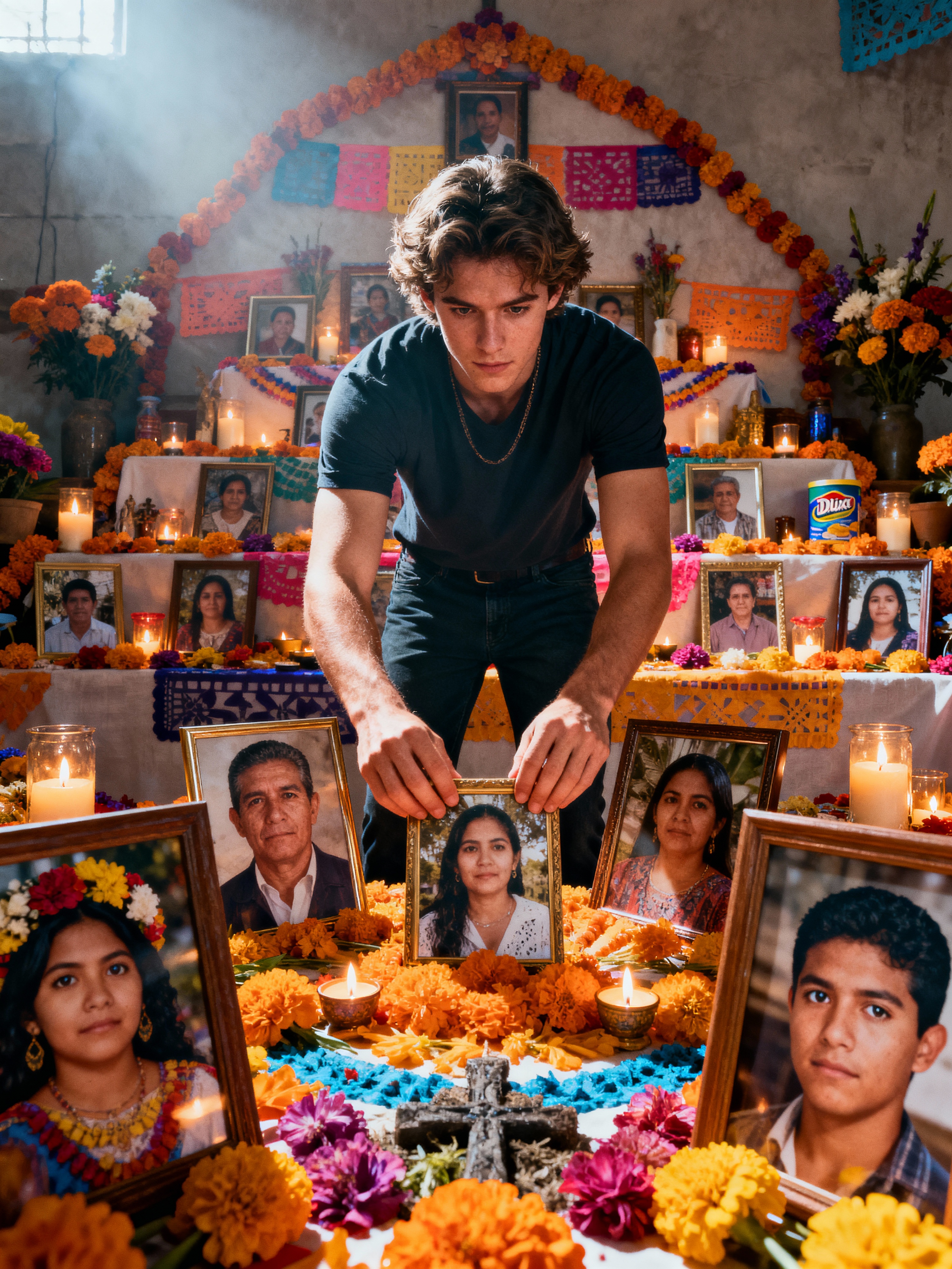 a model enjoying the Día de los Muertos atmosphere, with hands arranging photos on an ofrenda, radiating respect and celebration of life