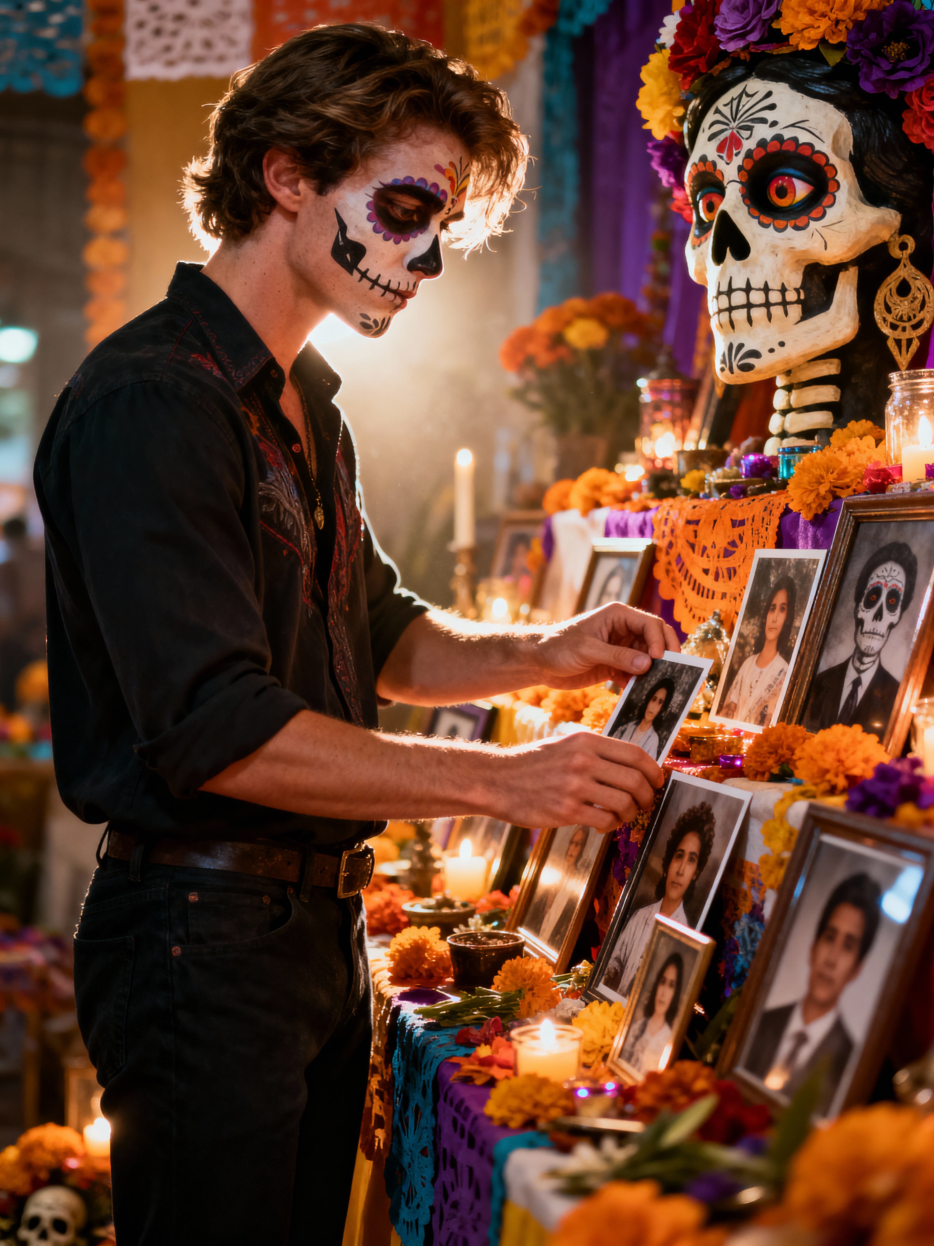 a model enjoying the Día de los Muertos atmosphere, with hands arranging photos on an ofrenda, radiating respect and celebration of life