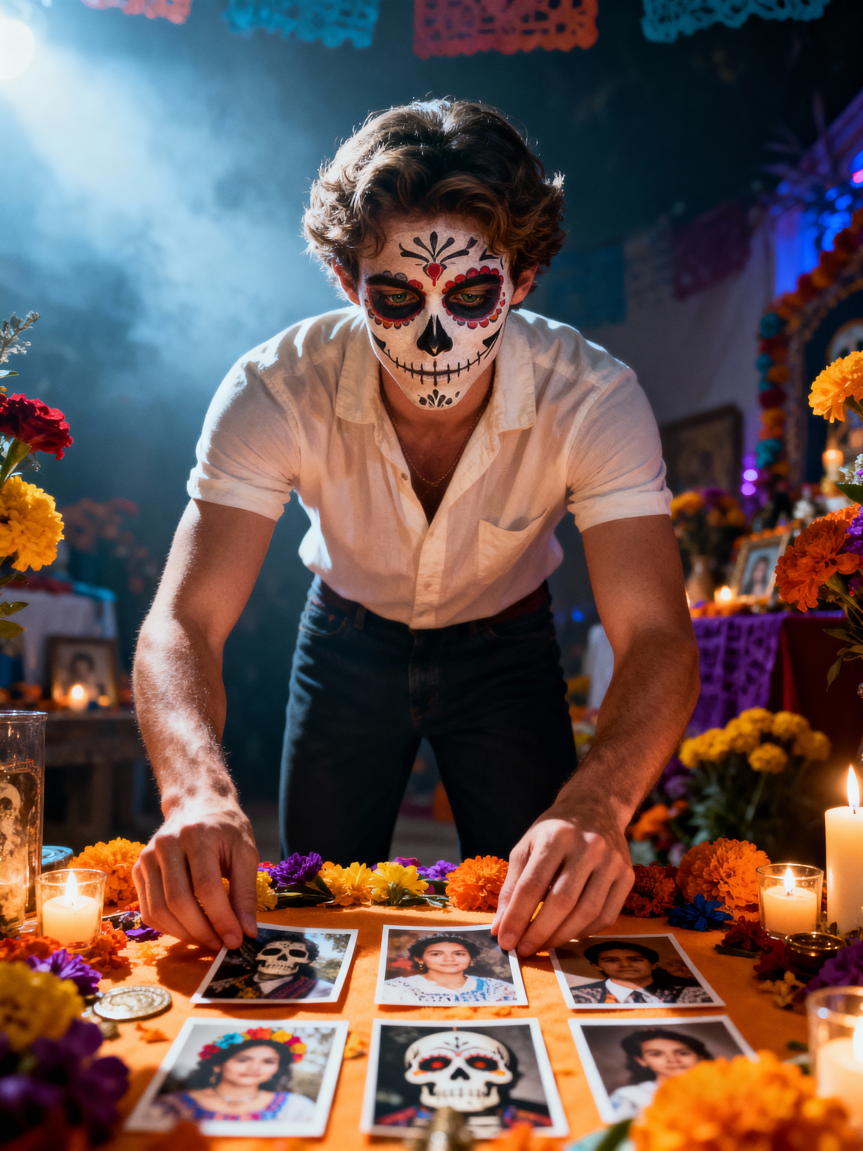 a model enjoying the Día de los Muertos atmosphere, with hands arranging photos on an ofrenda, radiating respect and celebration of life