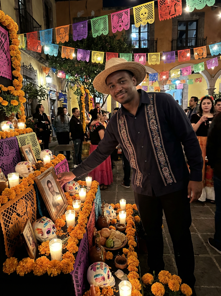 a model enjoying the Día de los Muertos atmosphere, with hands arranging photos on an ofrenda, radiating respect and celebration of life