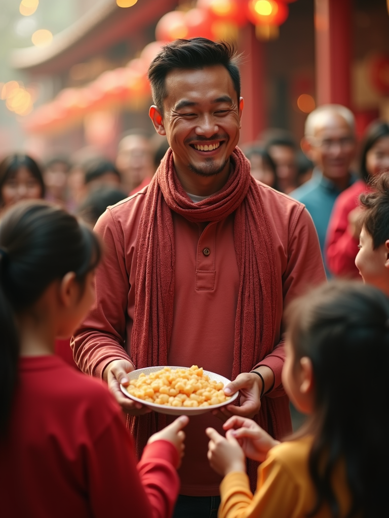 a model enjoying the Eid atmosphere, with hands giving Eidi to children, radiating happiness and generosity