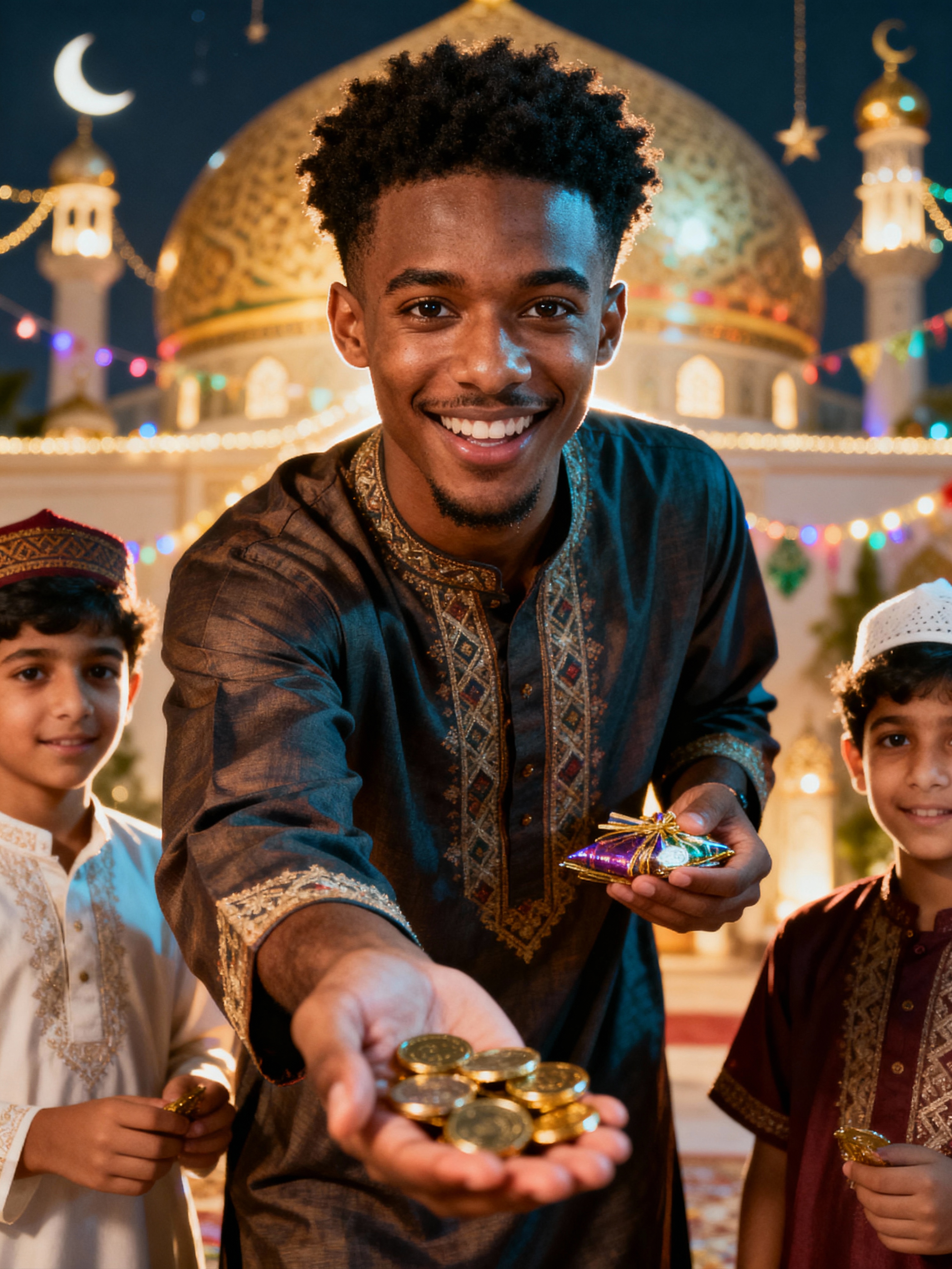 a model enjoying the Eid atmosphere, with hands giving Eidi to children, radiating happiness and generosity