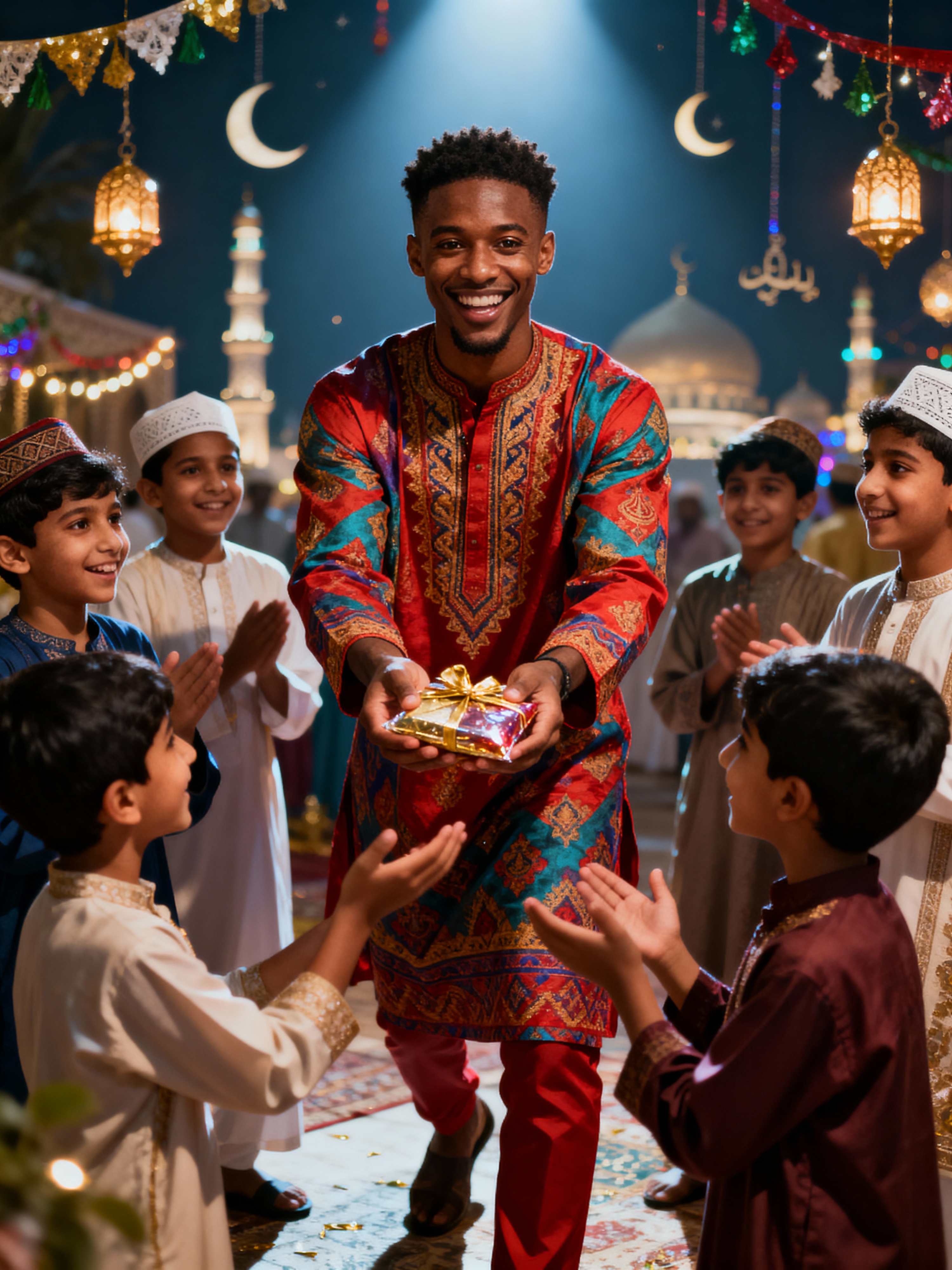 a model enjoying the Eid atmosphere, with hands giving Eidi to children, radiating happiness and generosity