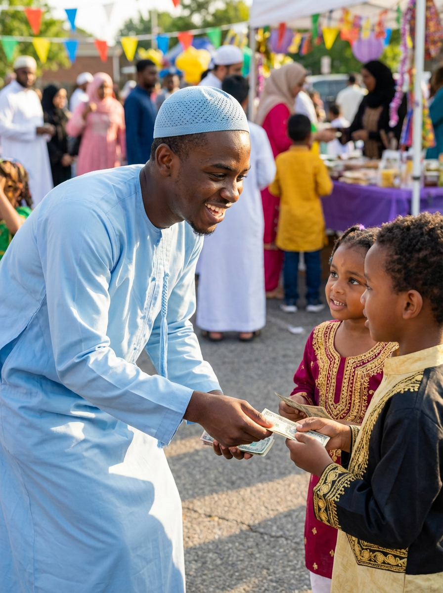 a model enjoying the Eid atmosphere, with hands giving Eidi to children, radiating happiness and generosity