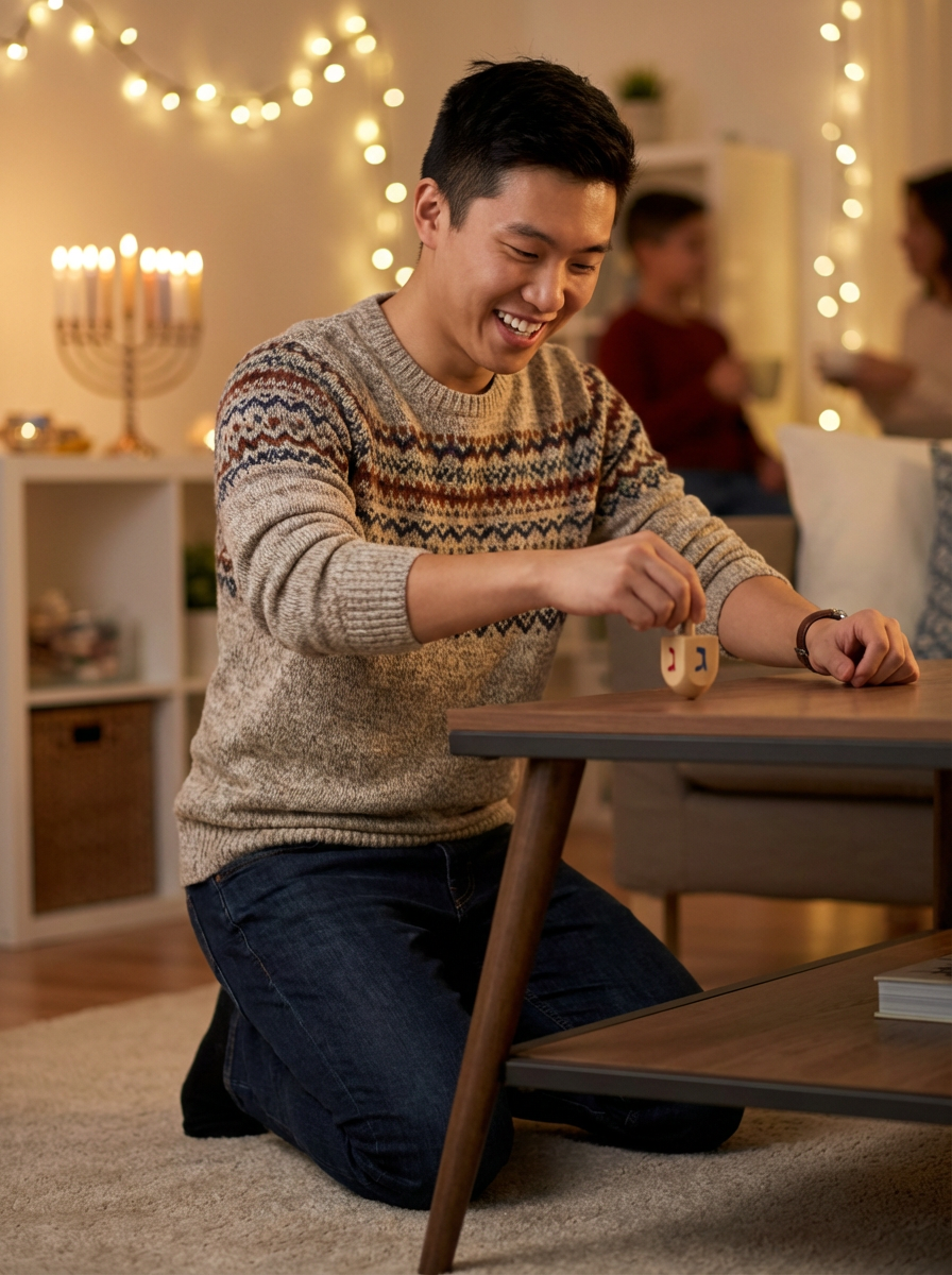 a model enjoying the Hanukkah atmosphere, with hands spinning a dreidel, radiating happiness and spiritual connection