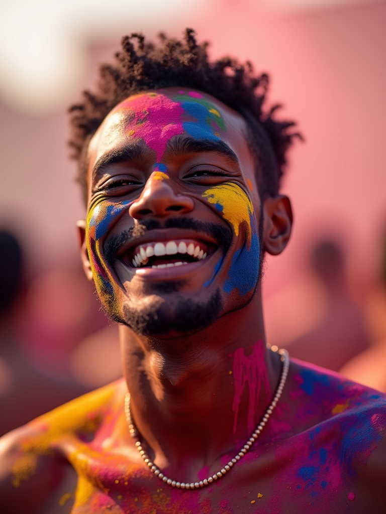 a model enjoying the Holi celebration, with vibrant colors covering his face and shoulders, radiating joy under the bright festival lights