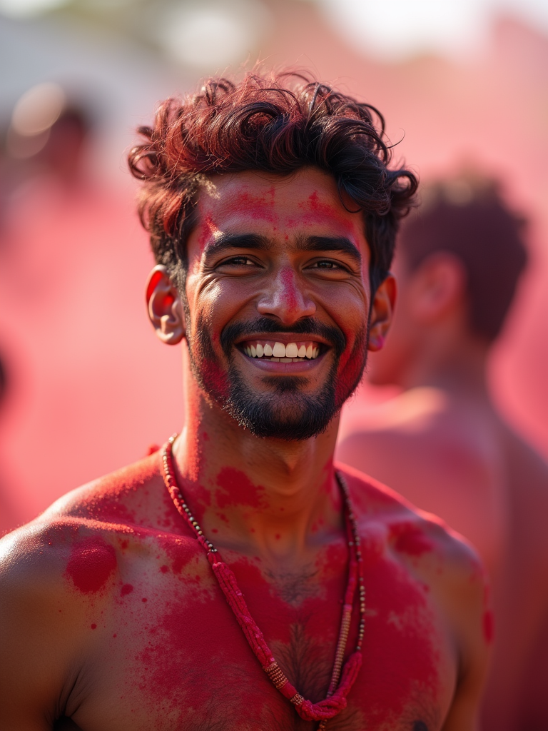 a model enjoying the Holi celebration, with vibrant colors covering his face and shoulders, radiating joy under the bright festival lights