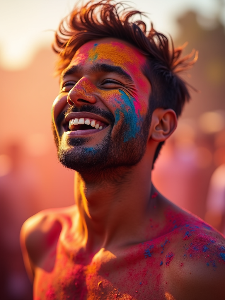 a model enjoying the Holi celebration, with vibrant colors covering his face and shoulders, radiating joy under the bright festival lights