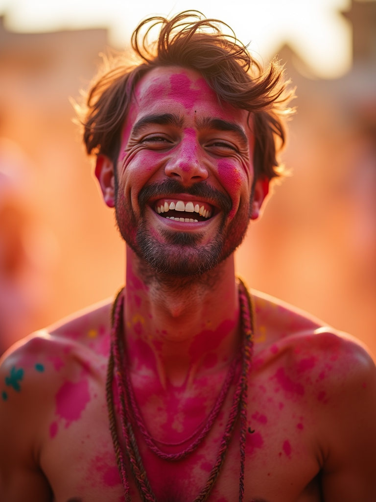 a model enjoying the Holi celebration, with vibrant colors covering his face and shoulders, radiating joy under the bright festival lights