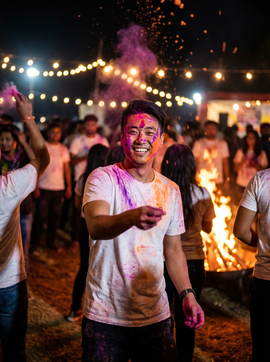 a model enjoying the Holi celebration, with vibrant colors covering his face and shoulders, radiating joy under the bright festival lights