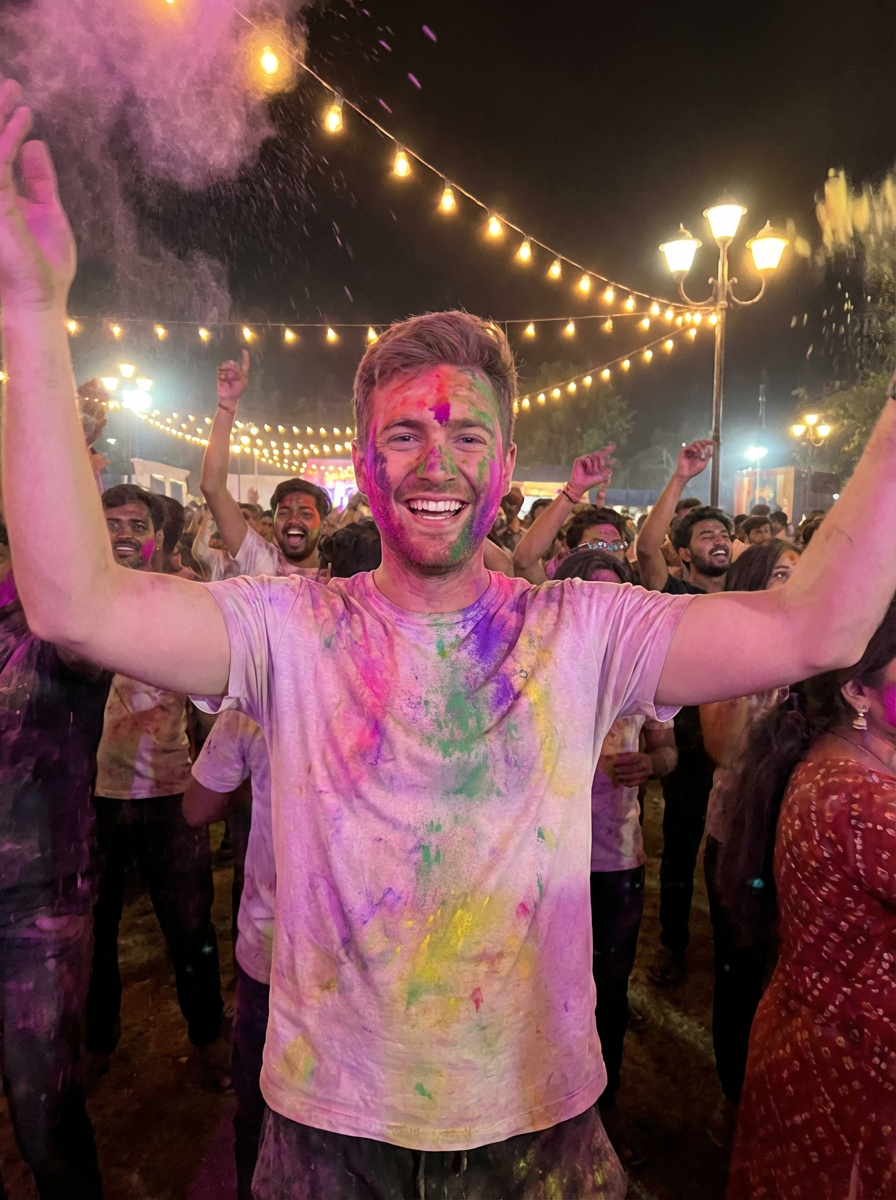 a model enjoying the Holi celebration, with vibrant colors covering his face and shoulders, radiating joy under the bright festival lights