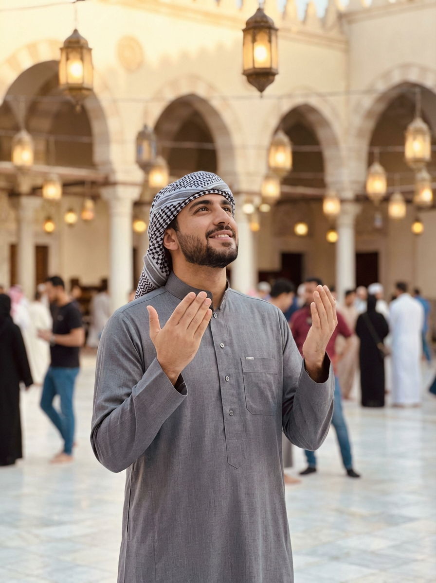 a model enjoying the Ramadan atmosphere, with hands raised in prayer under soft lantern light, radiating peace and spirituality