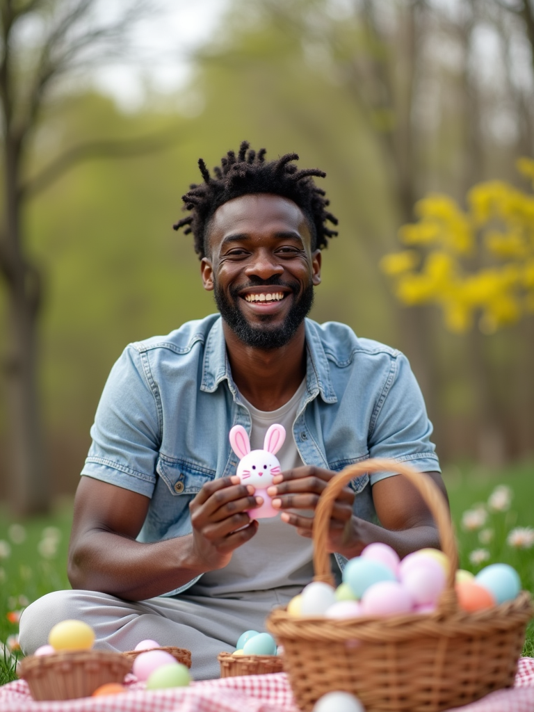 A model having a fun Easter picnic, with decorated eggs, baskets, and spring flowers in the background.