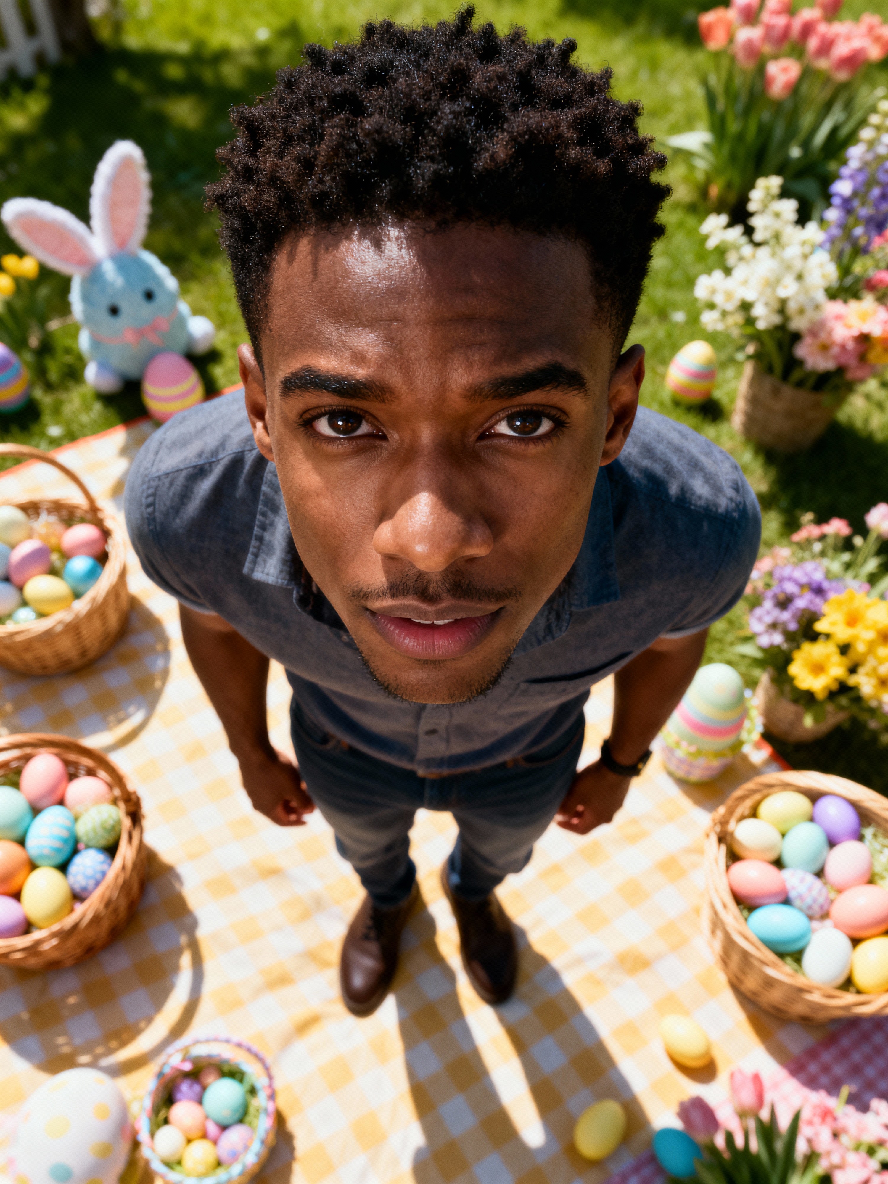 A model having a fun Easter picnic, with decorated eggs, baskets, and spring flowers in the background.