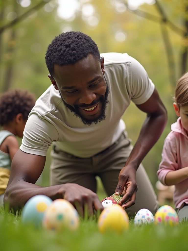 A model having an Easter egg hunt, with children searching for hidden eggs in a beautiful garden setting.