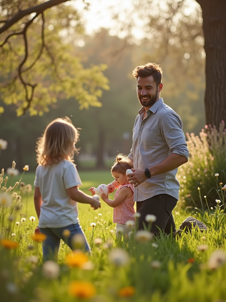 A model having an Easter egg hunt, with children searching for hidden eggs in a beautiful garden setting.